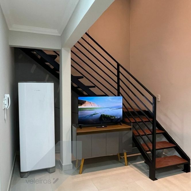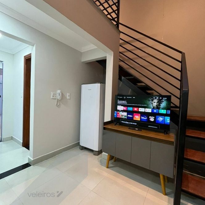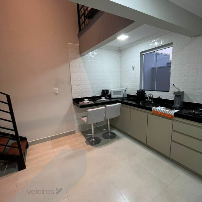 Nosso espaço é completo e conta com diversos itens que irão facilitar o seu dia a dia, como micro-ondas, ar condicionado, geladeira e armários planejados na cozinha para melhor organização. Além disso, oferecemos filtro de água, chuveiro com box de blindex, fogão, e para aqueles momentos de lazer, uma TV no andar térreo e um quarto no mezanino com cama, guarda-roupa e um projetor para tela ampliada.